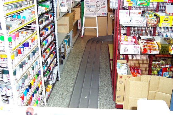 店内いっぱいに作ってしまった為、こんなところまでコースが・・・ちなみにここを走行中はミニ四駆は見えません。